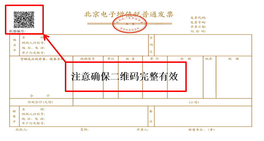 请注意保存已取得的电子发票,不得擅自涂改、损毁电子发票。电子发票左上角的二维码是提取电子发票数据的唯一标识(见附图),请确保该二维码完整有效,避免因使用大头针等造成二维码失效。