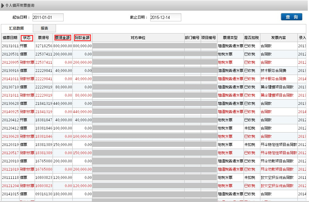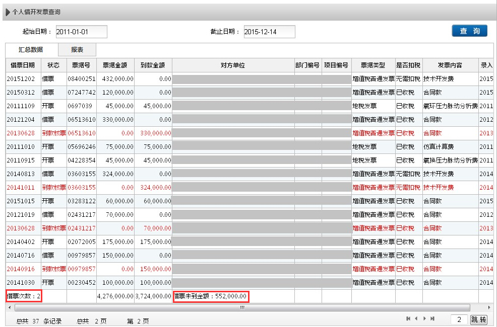 3.若要快速查询是否有借票未冲销的情况,可以根据表格下方的借票次数和借票未到金额判断,若借票次数>0,同时借票未到金额>0,即可确定有借票未冲销的项目,在对应只有“借票”记录没有“到款核票”记录的明细查询哪笔借票记录没有冲销,进而进行清理。