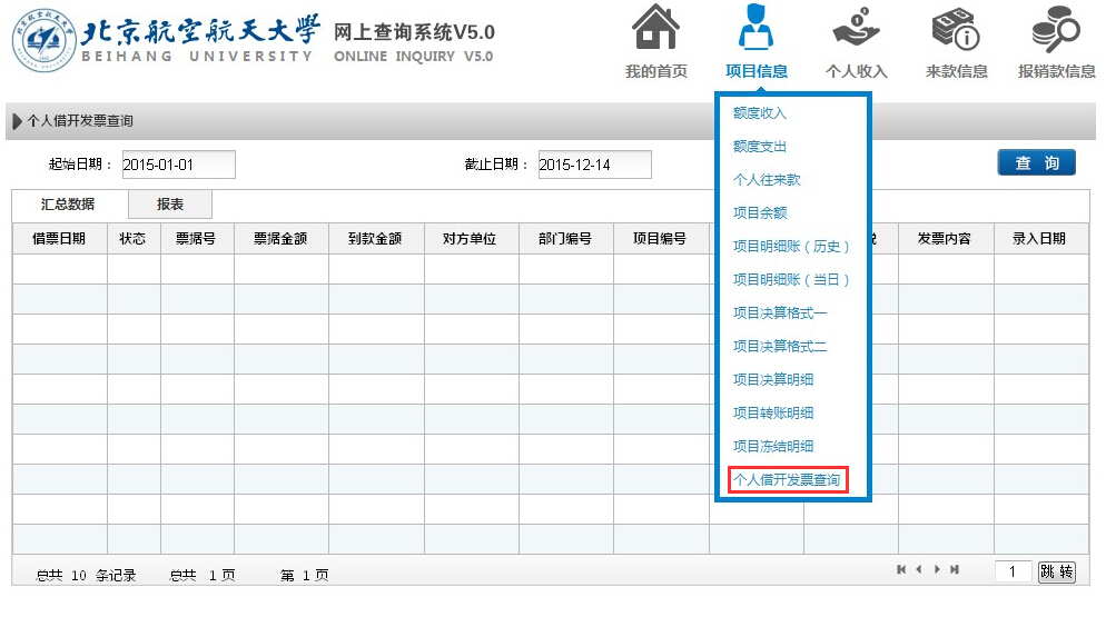 1.登陆财务处网站(网址:http://cwc.dienj.com/)“网上财务综合信息系统”,点击进入“网上查询”模块,选择 “项目信息”栏目的“个人借开发票查询”按钮。