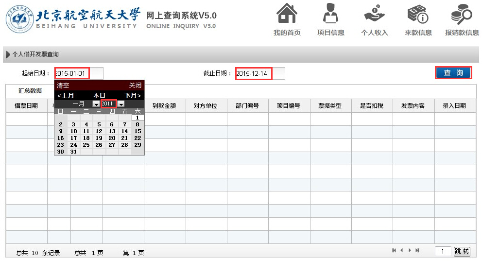 根据《关于做好2015年年终财务决算有关工作的通知》(校财函字[2015]5号)文件要求,按照年终工作安排,自11月12日起至12月25日之间集中开展各院(系)、部(处)借开票据清理工作。为了方便各位经费负责人查询发票借开及核销记录,财务处自即日起启用借开发票网上查询功能。