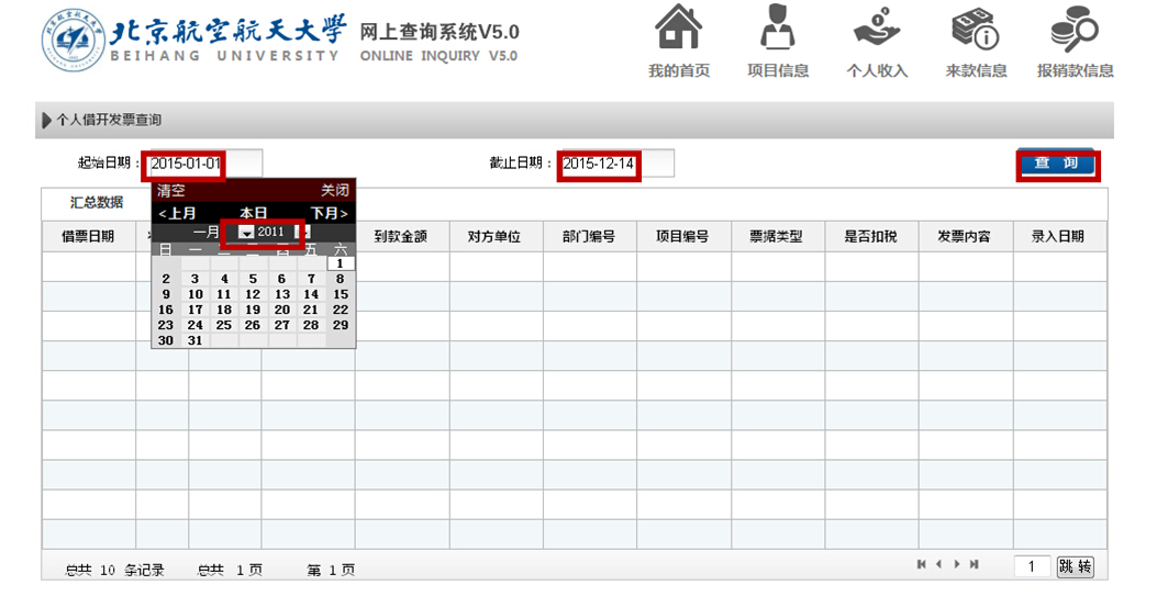 2.选择“起始日期”和“截止日期”,点击“查询”按钮即可查询相应期间内的发票开具信息。由于存在借票时间较早、而相应发票的核票时间较晚的情况,为了保证查询数据的准确性,选择开始日期时,应选择2010年1月1日,截止日期应选择查询当天的日期。