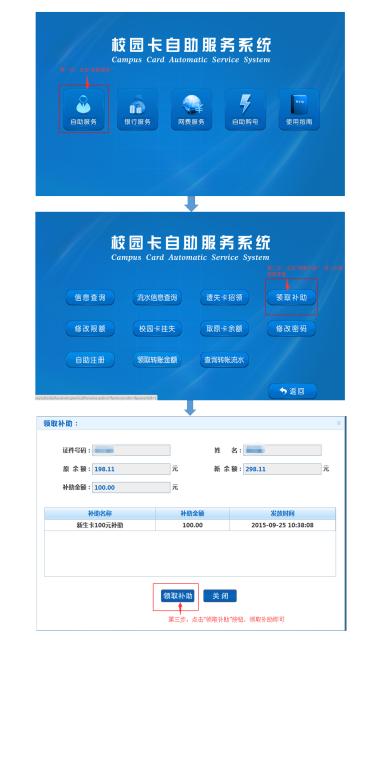 由于部分2015级本科新生校园卡卡片问题,此部分学生未能成功预存资金,现进行补发。补发方法为:在校园卡自助机(包含各宿舍楼和各食堂自助机)上领取。