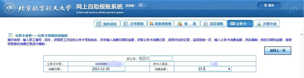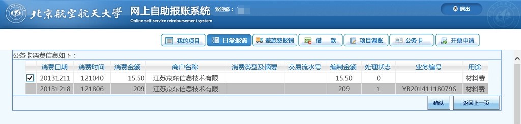 选择已编制的公务卡消费记录,确认返回报销界面完成报销单填写。