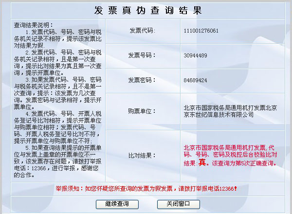 可登录北京市地方税务局网站发票信息查询系统(http://zwcx.tax861.gov.cn/)进行查询,依次正确输入发票代码、号码、密码、验证码,点击[查询]按钮查询发票真伪信息。查询结果如下图所示: