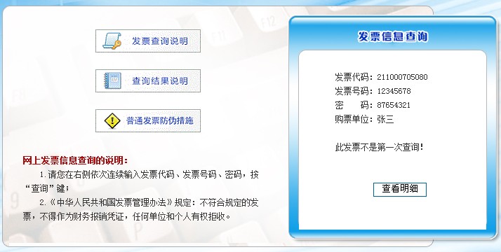 发票代码、号码、密码与税务机关记录相符时,点击[查询明细]按钮继续查询发票明细信息,并将查询明细结果作为发票附件。
