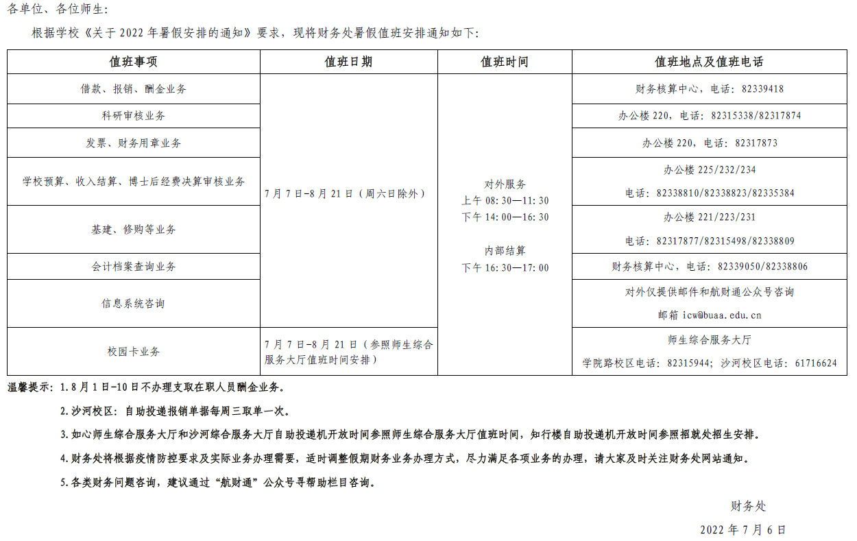 关于财务处2022年暑假值班安排的通知