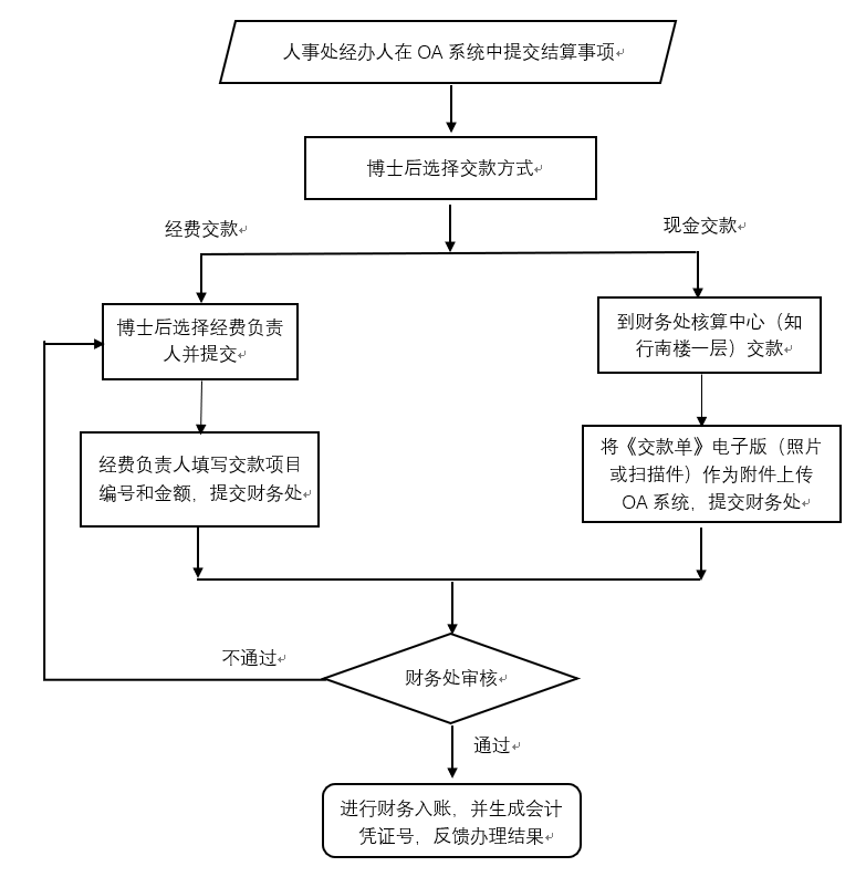4.财务处对于符合规定的结算申请进行财务入账,并生成会计凭证号,反馈办理结果;对于不符合规定的结算申请,注明原因,退回博士后重新提交。